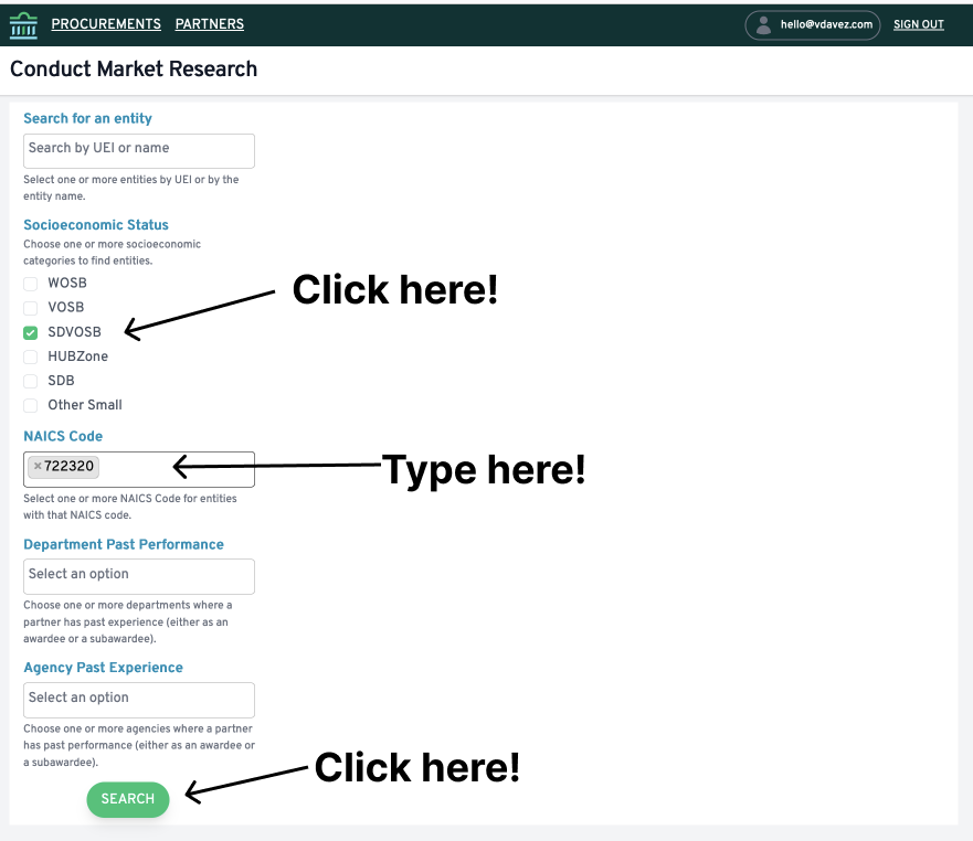 Let’s say you wanted to find a service-disabled veteran-owned small business that provides catering services. To find a potential partner, you would first navigate to the research tab. There, you could click the “SDVOSB” button, and type in “cater” into the NAICS code field (it should allow you to autocomplete to 722320). Then, press “SEARCH.”